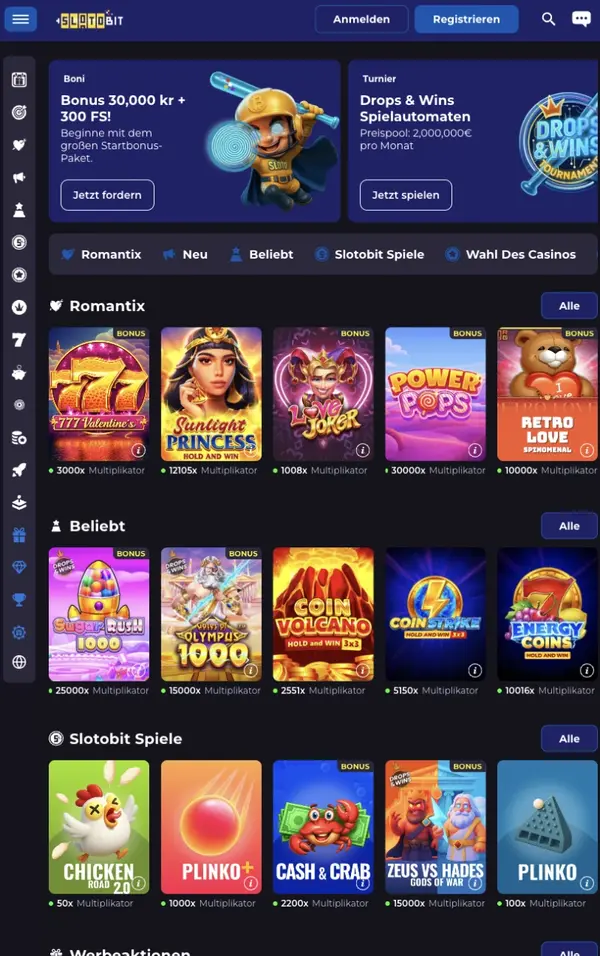 Mobil kannst du Spielautomaten, Live-Dealer-Spiele, Tischspiele, Crash Games, virtuelle Sportarten, Bingo, Jackpot-Titel und Rubbellose aus unserer Bibliothek mit 11.000 Spielen genießen. Wenn du schnelle Spins magst, sind Slotobit Spielautomaten leicht über die Lobby und die Suchleiste erreichbar. Wichtige Aktionen halten wir ebenfalls griffbereit, darunter Einzahlungen, Auszahlungen und jedes Slotobit Bonus-Angebot, für das du berechtigt bist.